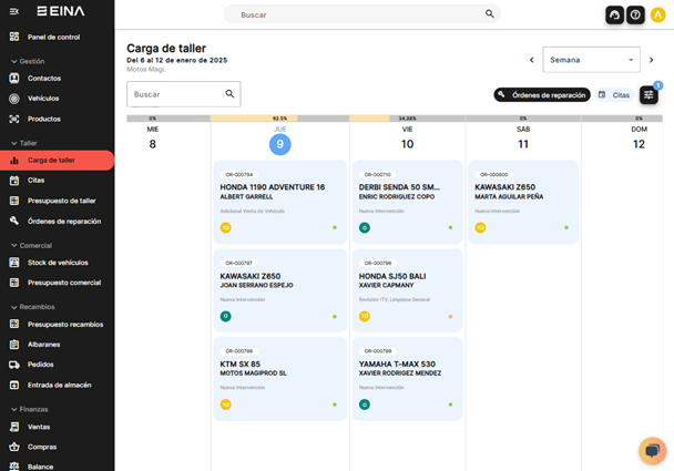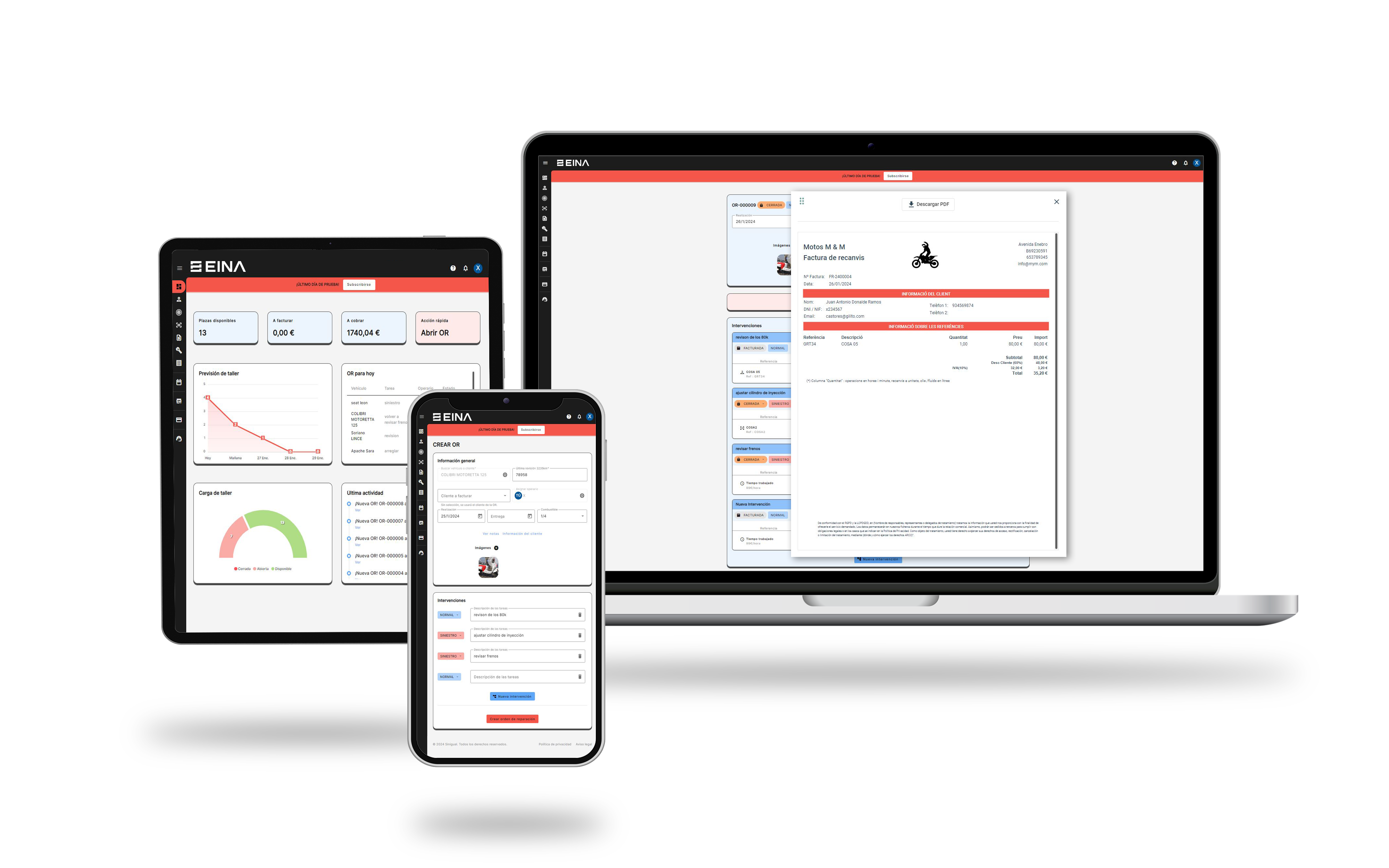 ¡Sí, EINA es completamente multidispositivo! Puedes acceder a nuestra plataforma desde cualquier lugar y en cualquier momento. Ya sea que uses un móvil, tablet, PC, Mac o Windows, todo funciona de manera fluida desde tu navegador web, sin necesidad de descargar ninguna aplicación adicional. Esto asegura que puedas gestionar tu taller de motos con total flexibilidad y comodidad, estés donde estés.