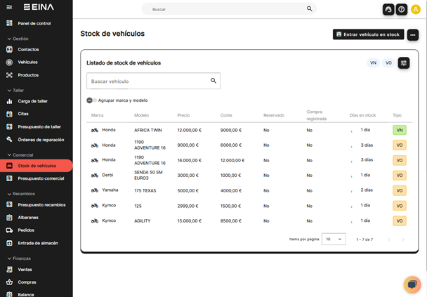 Gestiona el stock de motos, define marcas, modelos y series, y realiza ventas o crea presupuestos con o sin stock para informar sobre tu oferta. Añade conceptos a las facturas, como matriculaciones, transportes o descuentos, y controla los costes de cada venta.